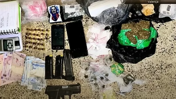 Os itens encontrados incluíram 21 papelotes de cocaína, 28 munições calibre 9mm, 3 carregadores de 9mm, 2 balanças de precisão, 1 caderno de anotações, 2 smartphones, 37 pedras de crack, 37 pequenos papelotes de maconha, 4 grandes papelotes de maconha, 300 gramas de maconha prensada, 72 gramas de crack em pedras, 220 gramas de cocaína em pedaço, R$ 261,00 em espécie e 1 macacão camuflado.